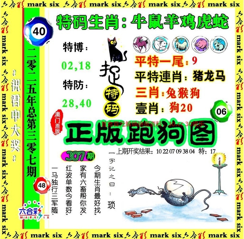 | 307期七肖 | 兔鼠龙猪狗猴羊 | 开:狗20 |